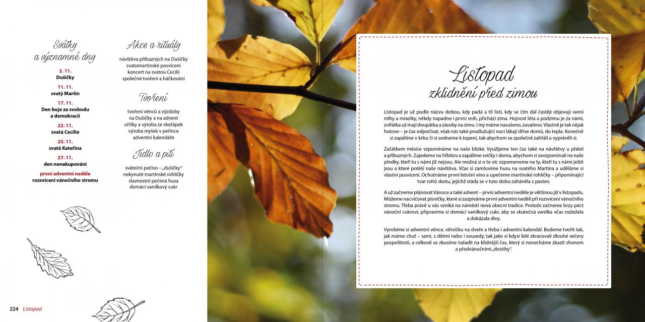 Kniha obsahuje dvanáct kapitol podle měsíců v roce. Každý měsíc má svou poetiku, své svátky, obyčeje i tradice, ale také praktický dopad – jak dětem vše vysvětlit, co si připravit a uvařit, jak si svátky s rodinou a přáteli, ale třeba i se sousedy co nejlépe užít?